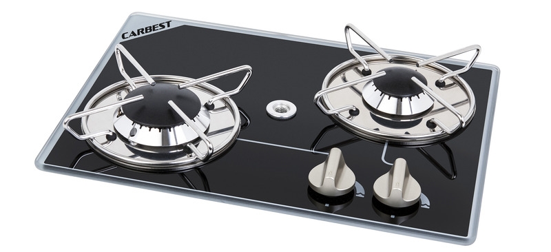Carbest indbygningsgaskomfur, 2 brændere, fremstillet af sikkerhedsglas i sort. Med tændingssikring. Godkendt til 30mbar. Manuel tænding. Effekt 1 x 1,8 KW, 1 x 2,8 KW, forbrug 205 g/h, 3,5 kg.