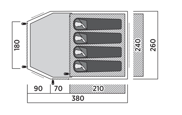 Lomsdal 4 er et alsidigt kuppelformet telt med et udvidet opbevaringsområde og to adgangsdøre for ekstra bekvemmelighed. Teltet har en stor veranda med aftagelig bunddug, hvilket gør det nemt at sætte op og vedligeholde. SleepTight-inderteltet blokerer for lys og sikrer en rolig søvn – perfekt til morgener og tidlige aftener. Ideelt til at få mest muligt ud af ethvert udendørseventyr.