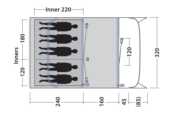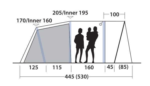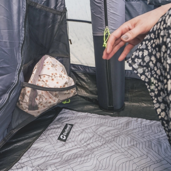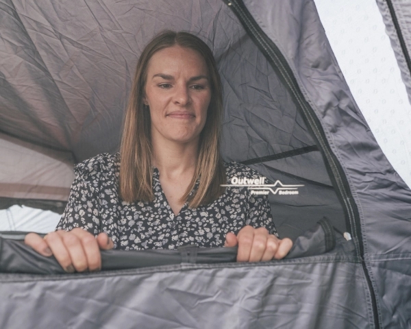 Sidevinduerne lyser opholdsområdet op med naturligt lys, mens forteltet giver ly og skygge til udendørs spisning og leg. Perfekt til mindre familier eller de første campingture med små børn, tilbyder det ventilation gennem hele teltet for et bedre indeklima. Den patenterede magnetiske Quick & Quiet indvendige dør sikrer nem og støjfri adgang til soveværelserne.