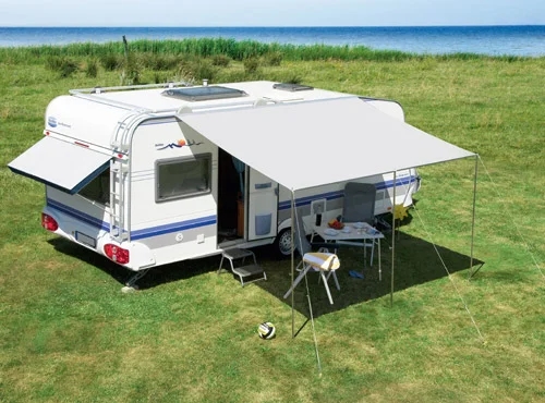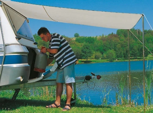 Et solsejl som er nyttigt overalt! Som mobil carport på campingvognens hæk, på siden - som markise, der giver skygge. Fremstillet i trailtex-stof der kan ånde, er afvaskeligt, lysægte og meget stærkt.